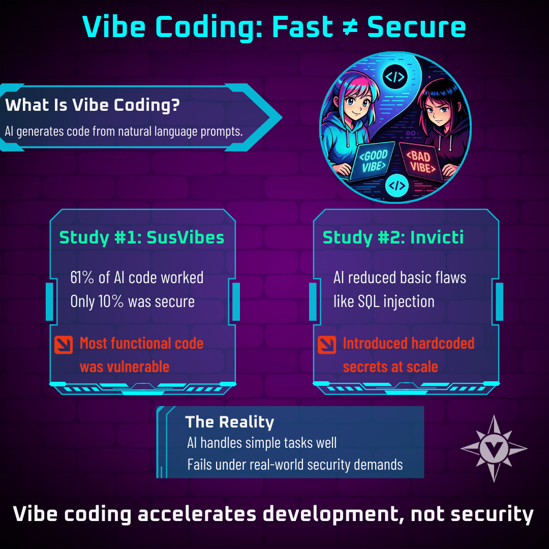 This article really examines two distinct studies that were very recent. One done as part of a university collab and the other more from private firm. Both studies have reputable formats in their studies and produce interesting results. For me (and hopefully for you) we have to recognize that these studies will be required to be examined more often as an industry and even as part of internal benchmarking research within companies and groups that are looking to analyze the fruits (or spoils) of vibe coding efforts. It’s important to remind that at this stage of where we are with AI inclusion in software development and product build outs, that there shouldn’t be a conclusive study that encourages or disuades those that are considering vibe coding. As with anything new, there are truly valuable assets to vibe coding however these studies do manifest a dichotomy from their research on clear gaps in accuracy and reliability but at the same time opportunities to truly operationalize security at scale by extrapolating and operationalizing the functional parts that do work and to ensure continued benchmarking as part of the process.