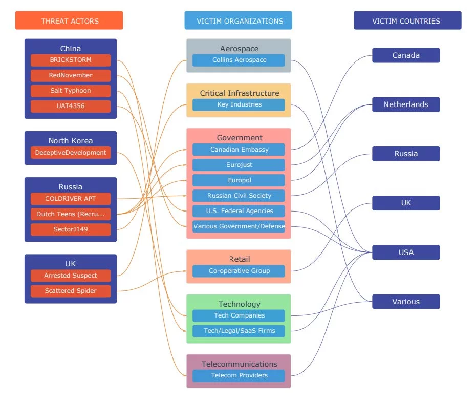 Ransomware groups (Radiant, Scattered Spider) intensified double extortion, breaching aviation, automotive, casinos, and even preschools. Cyber-physical convergence was highlighted by France’s Natural History Museum heist, where ransomware disabled alarms to facilitate theft. Malware families (BRICKSTORM, BAITSWITCH) embedded in critical infrastructure showed long-term persistence and stealth. The rise of Loader-as-a-Service botnets for Mirai payloads demonstrates commoditized malware delivery, lowering entry barriers for attackers.